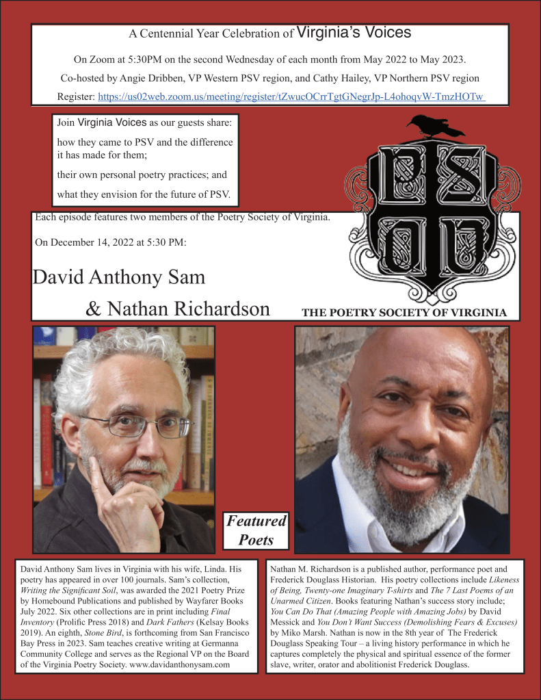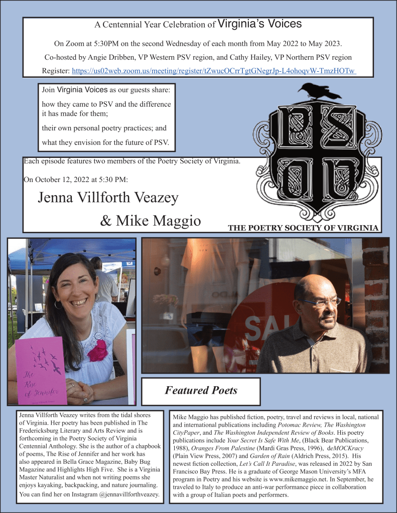 Virginia Voices is an interview and reading series hosted by Angela Dribben and Cathy Hailey, an initiative to spotlight members of The Poetry Society of Virginia as part of the celebration of our 2023 Centennial. Interviews take place the second Wednesday of each month at 5:30 p.m. Register here. Recordings are posted after each episode.